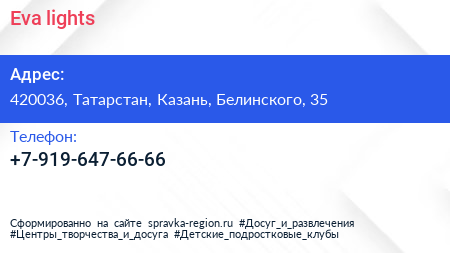 Eva-lights по адресу 420036, Татарстан, Казань, Белинского, 35 в дальнейшем Организация, размещена в следующих категориях: