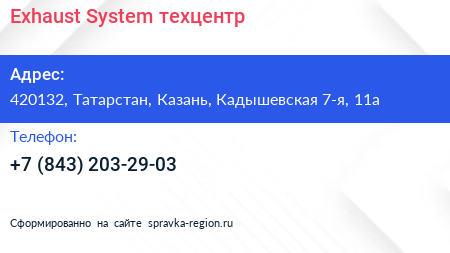 Exhaust System, техцентр по адресу 420132, Татарстан, Казань, Кадышевская 7-я, 11а в дальнейшем Организация, размещена в следующих категориях: