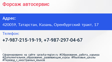 Форсаж, автосервис по адресу 420059, Татарстан, Казань, Оренбургский тракт, 17 в дальнейшем Организация, размещена в следующих категориях: