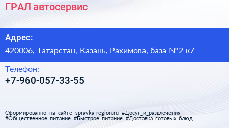 ГРАЛ, автосервис по адресу 420006, Татарстан, Казань, Рахимова, база №2 к7 в дальнейшем Организация, размещена в следующих категориях: