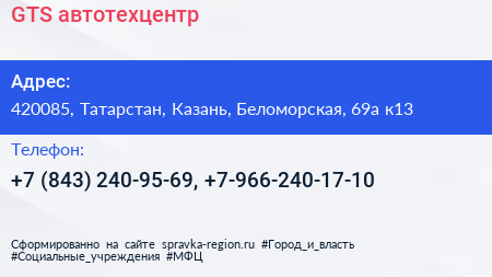GTS, автотехцентр по адресу 420085, Татарстан, Казань, Беломорская, 69а к13 в дальнейшем Организация, размещена в следующих категориях: