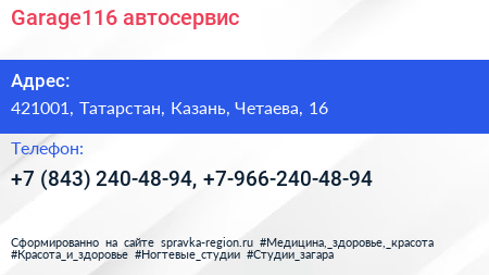 Garage116, автосервис по адресу 421001, Татарстан, Казань, Четаева, 16 в дальнейшем Организация, размещена в следующих категориях: