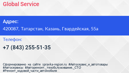 Global Service по адресу 420087, Татарстан, Казань, Гвардейская, 55а в дальнейшем Организация, размещена в следующих категориях: