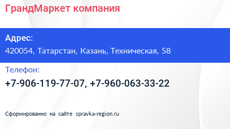 ГрандМаркет, компания по адресу 420054, Татарстан, Казань, Техническая, 58 в дальнейшем Организация, размещена в следующих категориях: