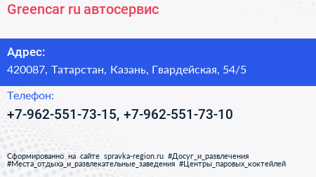 Greencar.ru, автосервис по адресу 420087, Татарстан, Казань, Гвардейская, 54/5 в дальнейшем Организация, размещена в следующих категориях: