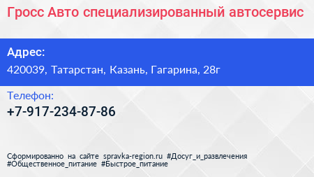 Гросс-Авто, специализированный автосервис по адресу 420039, Татарстан, Казань, Гагарина, 28г в дальнейшем Организация, размещена в следующих категориях: