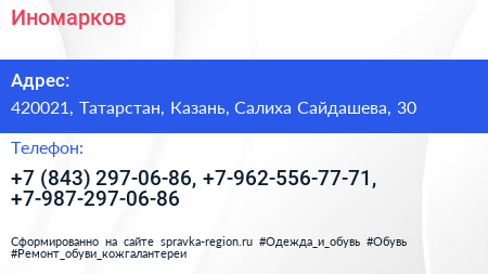 Иномарков по адресу 420021, Татарстан, Казань, Салиха Сайдашева, 30 в дальнейшем Организация, размещена в следующих категориях: