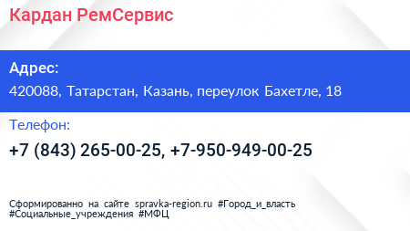 Кардан РемСервис по адресу 420088, Татарстан, Казань, переулок Бахетле, 18 в дальнейшем Организация, размещена в следующих категориях: