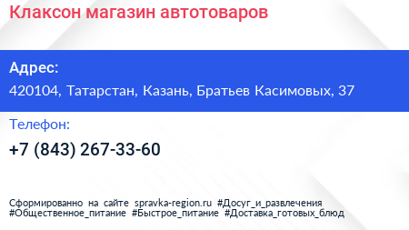 Клаксон, магазин автотоваров по адресу 420104, Татарстан, Казань, Братьев Касимовых, 37 в дальнейшем Организация, размещена в следующих категориях: