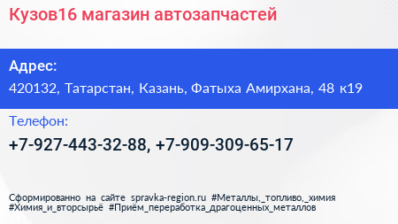 Кузов16, магазин автозапчастей по адресу 420132, Татарстан, Казань, Фатыха Амирхана, 48 к19 в дальнейшем Организация, размещена в следующих категориях: