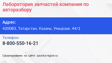 Лаборатория запчастей, компания по авторазбору по адресу 420083, Татарстан, Казань, Умырзая, 44/1 в дальнейшем Организация, размещена в следующих категориях: