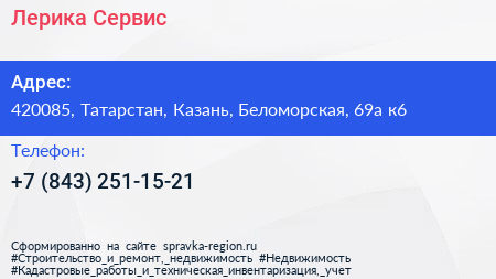 Лерика Сервис по адресу 420085, Татарстан, Казань, Беломорская, 69а к6 в дальнейшем Организация, размещена в следующих категориях: