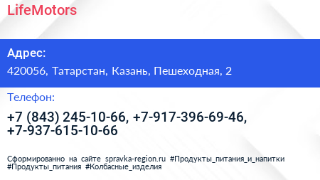 LifeMotors по адресу 420056, Татарстан, Казань, Пешеходная, 2 в дальнейшем Организация, размещена в следующих категориях: