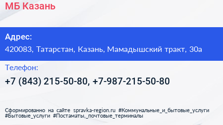 МБ-Казань по адресу 420083, Татарстан, Казань, Мамадышский тракт, 30а в дальнейшем Организация, размещена в следующих категориях: