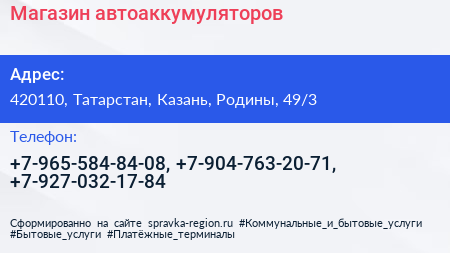 Магазин автоаккумуляторов по адресу 420110, Татарстан, Казань, Родины, 49/3 в дальнейшем Организация, размещена в следующих категориях: