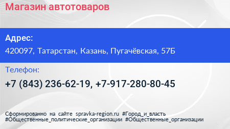 Магазин автотоваров по адресу 420097, Татарстан, Казань, Пугачёвская, 57Б в дальнейшем Организация, размещена в следующих категориях: