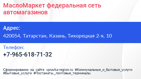 МаслоМаркет, федеральная сеть автомагазинов по адресу 420054, Татарстан, Казань, Тихорецкая 2-я, 10 в дальнейшем Организация, размещена в следующих категориях:
