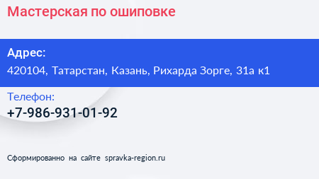 Мастерская по ошиповке по адресу 420104, Татарстан, Казань, Рихарда Зорге, 31а к1 в дальнейшем Организация, размещена в следующих категориях: