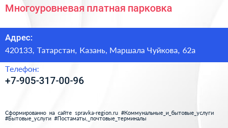 Многоуровневая платная парковка по адресу 420133, Татарстан, Казань, Маршала Чуйкова, 62а в дальнейшем Организация, размещена в следующих категориях: