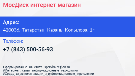 МосДиск, интернет-магазин по адресу 420036, Татарстан, Казань, Копылова, 1г в дальнейшем Организация, размещена в следующих категориях: