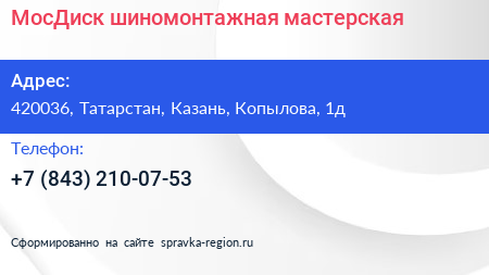 МосДиск, шиномонтажная мастерская по адресу 420036, Татарстан, Казань, Копылова, 1д в дальнейшем Организация, размещена в следующих категориях: