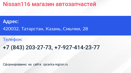 Nissan116, магазин автозапчастей по адресу 420032, Татарстан, Казань, Смычки, 28 в дальнейшем Организация, размещена в следующих категориях:
