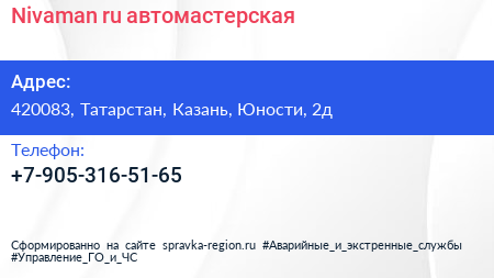 Nivaman.ru, автомастерская по адресу 420083, Татарстан, Казань, Юности, 2д в дальнейшем Организация, размещена в следующих категориях: