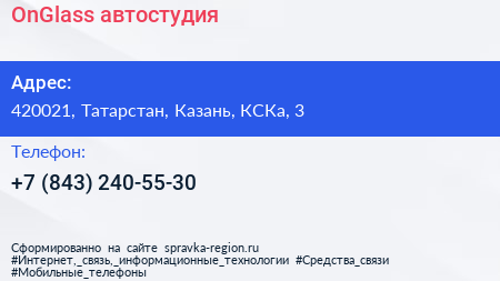 OnGlass, автостудия по адресу 420021, Татарстан, Казань, КСКа, 3 в дальнейшем Организация, размещена в следующих категориях: