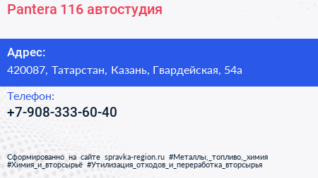Pantera 116, автостудия по адресу 420087, Татарстан, Казань, Гвардейская, 54а в дальнейшем Организация, размещена в следующих категориях: