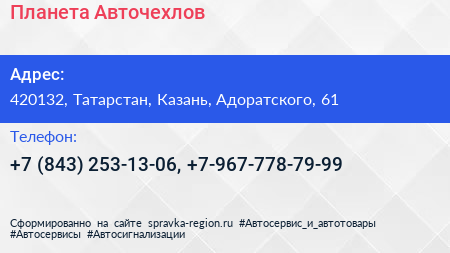 Планета Авточехлов по адресу 420132, Татарстан, Казань, Адоратского, 61 в дальнейшем Организация, размещена в следующих категориях: