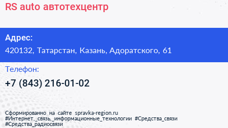 RS auto, автотехцентр по адресу 420132, Татарстан, Казань, Адоратского, 61 в дальнейшем Организация, размещена в следующих категориях: