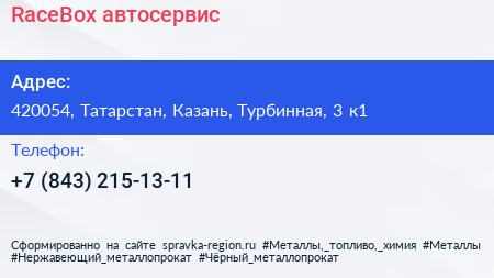 RaceBox, автосервис по адресу 420054, Татарстан, Казань, Турбинная, 3 к1 в дальнейшем Организация, размещена в следующих категориях: