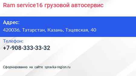 Ram-service16, грузовой автосервис по адресу 420036, Татарстан, Казань, Тэцевская, 40 в дальнейшем Организация, размещена в следующих категориях: