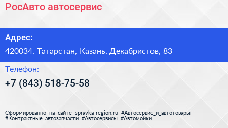 РосАвто, автосервис по адресу 420034, Татарстан, Казань, Декабристов, 83 в дальнейшем Организация, размещена в следующих категориях: