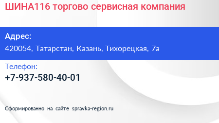 ШИНА116, торгово-сервисная компания по адресу 420054, Татарстан, Казань, Тихорецкая, 7а в дальнейшем Организация, размещена в следующих категориях: