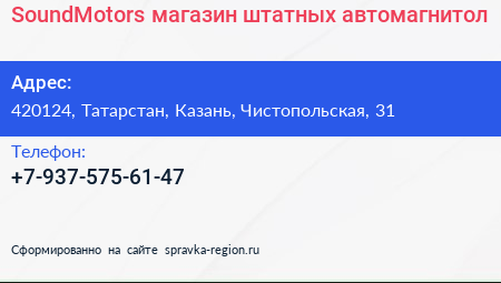 SoundMotors, магазин штатных автомагнитол по адресу 420124, Татарстан, Казань, Чистопольская, 31 в дальнейшем Организация, размещена в следующих категориях: