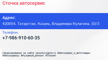 Сточка, автосервис по адресу 420054, Татарстан, Казань, Владимира Кулагина, 10/3 в дальнейшем Организация, размещена в следующих категориях: