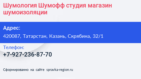 Шумология Шумофф, студия-магазин шумоизоляции по адресу 420087, Татарстан, Казань, Скрябина, 32/1 в дальнейшем Организация, размещена в следующих категориях: