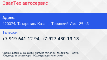 СвапТех, автосервис по адресу 420074, Татарстан, Казань, Троицкий Лес, 29 к3 в дальнейшем Организация, размещена в следующих категориях: