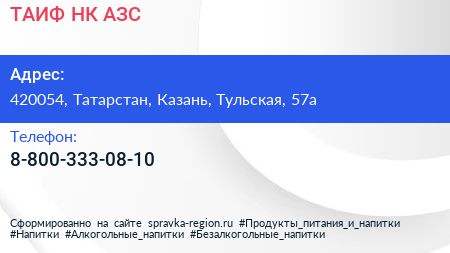 ТАИФ-НК АЗС по адресу 420054, Татарстан, Казань, Тульская, 57а в дальнейшем Организация, размещена в следующих категориях:
