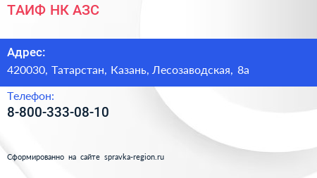 ТАИФ-НК АЗС по адресу 420030, Татарстан, Казань, Лесозаводская, 8а в дальнейшем Организация, размещена в следующих категориях: