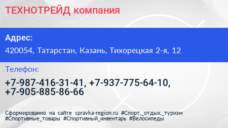 ТЕХНОТРЕЙД, компания по адресу 420054, Татарстан, Казань, Тихорецкая 2-я, 12 в дальнейшем Организация, размещена в следующих категориях: