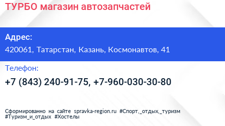 ТУРБО, магазин автозапчастей по адресу 420061, Татарстан, Казань, Космонавтов, 41 в дальнейшем Организация, размещена в следующих категориях: