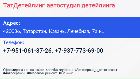 ТатДетейлинг, автостудия детейлинга по адресу 420036, Татарстан, Казань, Лечебная, 7а к1 в дальнейшем Организация, размещена в следующих категориях: