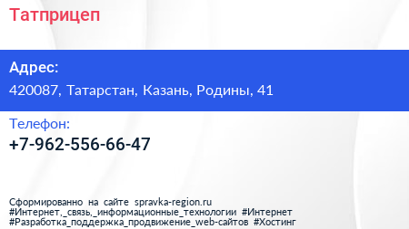 Татприцеп по адресу 420087, Татарстан, Казань, Родины, 41 в дальнейшем Организация, размещена в следующих категориях: