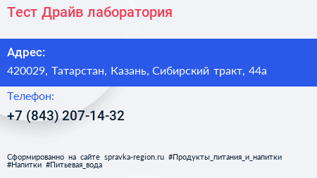 Тест-Драйв, лаборатория по адресу 420029, Татарстан, Казань, Сибирский тракт, 44а в дальнейшем Организация, размещена в следующих категориях: