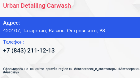 Urban Detailing Carwash по адресу 420107, Татарстан, Казань, Островского, 98 в дальнейшем Организация, размещена в следующих категориях: