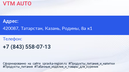 VTM-AUTO по адресу 420087, Татарстан, Казань, Родины, 8а к1 в дальнейшем Организация, размещена в следующих категориях: