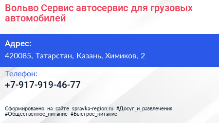 Вольво Сервис, автосервис для грузовых автомобилей по адресу 420085, Татарстан, Казань, Химиков, 2 в дальнейшем Организация, размещена в следующих категориях: