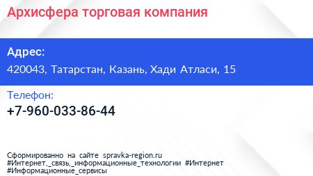 Архисфера, торговая компания по адресу 420043, Татарстан, Казань, Хади Атласи, 15 в дальнейшем Организация, размещена в следующих категориях: